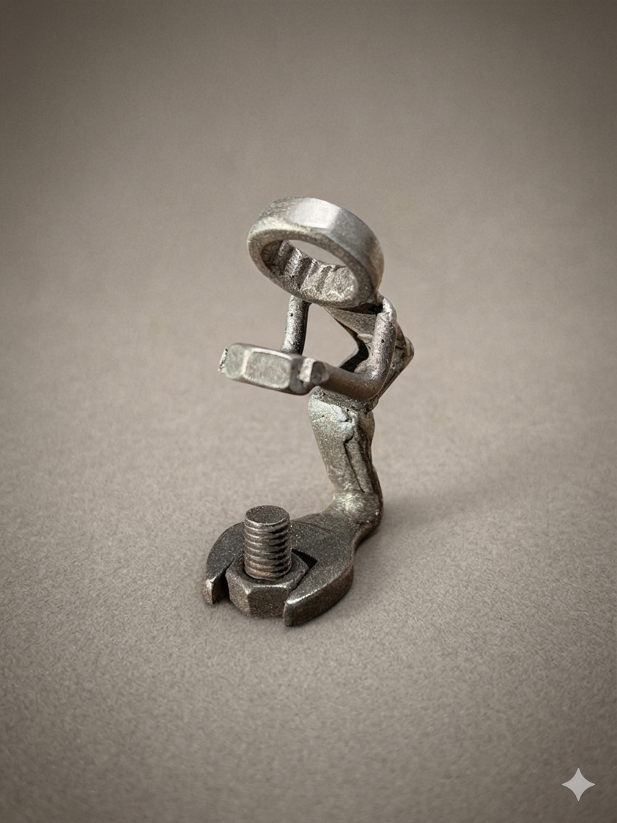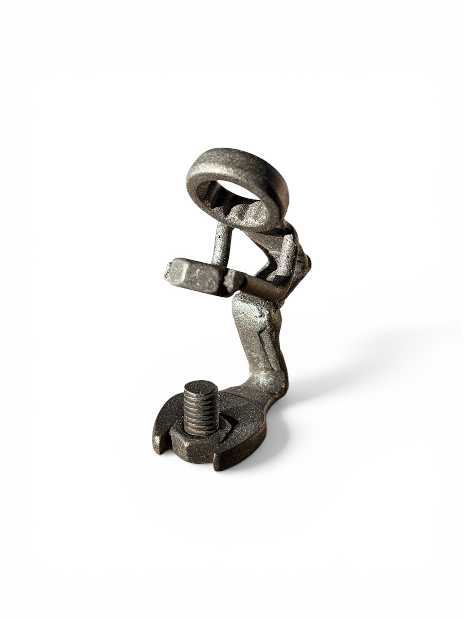 Cette sculpture en métal, entièrement façonnée à la main dans nos propres ateliers, exprime à la fois la force du matériau brut et la finesse du geste artisanal. Chaque personnage, soudé et modelé avec minutie, raconte une histoire : l’effort, la concentration, ou le mouvement, capturés dans une posture pleine de caractère.