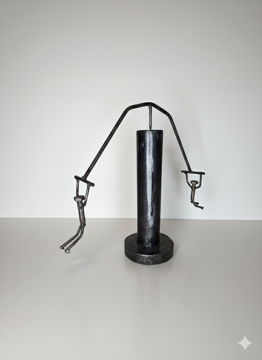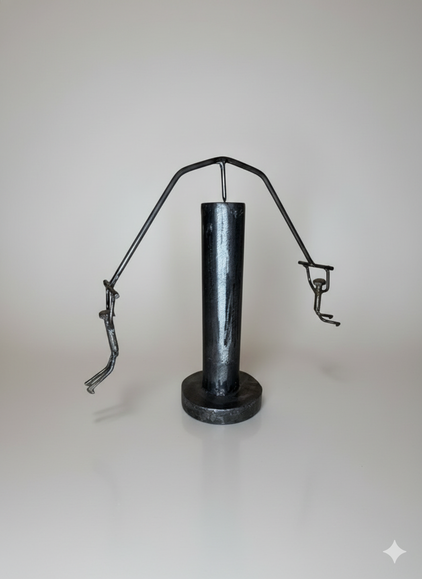 Cette sculpture en métal, entièrement façonnée à la main dans nos propres ateliers, exprime à la fois la force du matériau brut et la finesse du geste artisanal. Chaque personnage, soudé et modelé avec minutie, raconte une histoire : l’effort, la concentration, ou le mouvement, capturés dans une posture pleine de caractère.