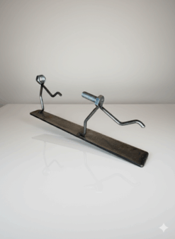 Cette sculpture en métal, entièrement façonnée à la main dans nos propres ateliers, exprime à la fois la force du matériau brut et la finesse du geste artisanal. Chaque personnage, soudé et modelé avec minutie, raconte une histoire : l’effort, la concentration, ou le mouvement, capturés dans une posture pleine de caractère.