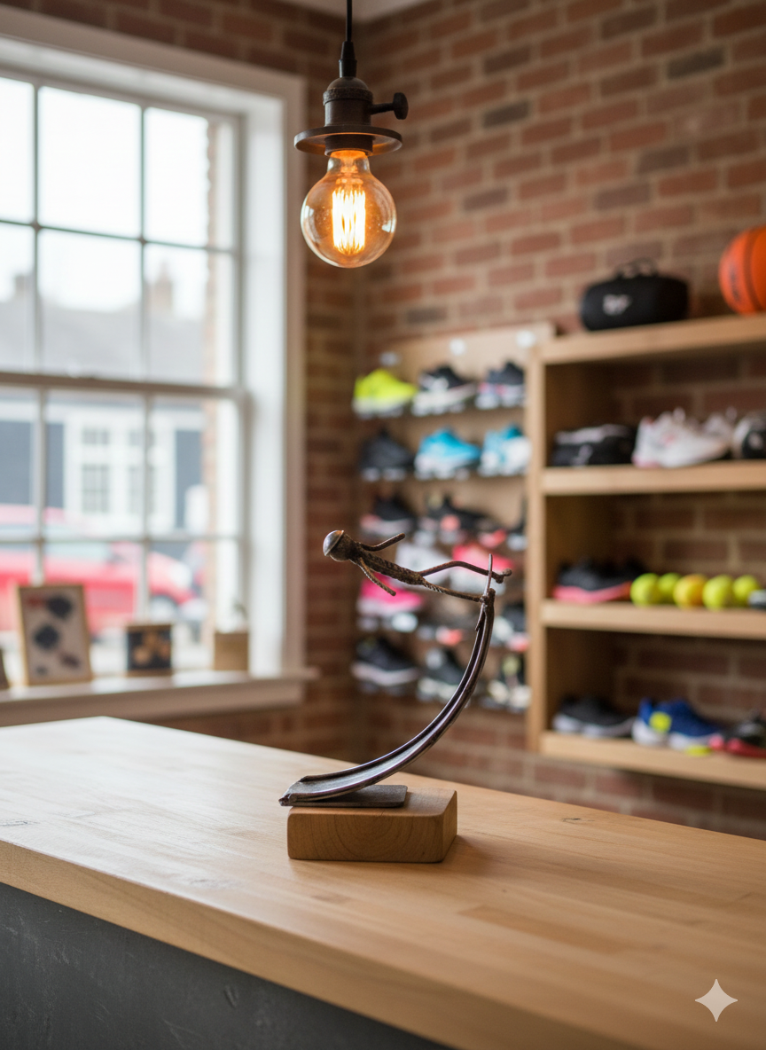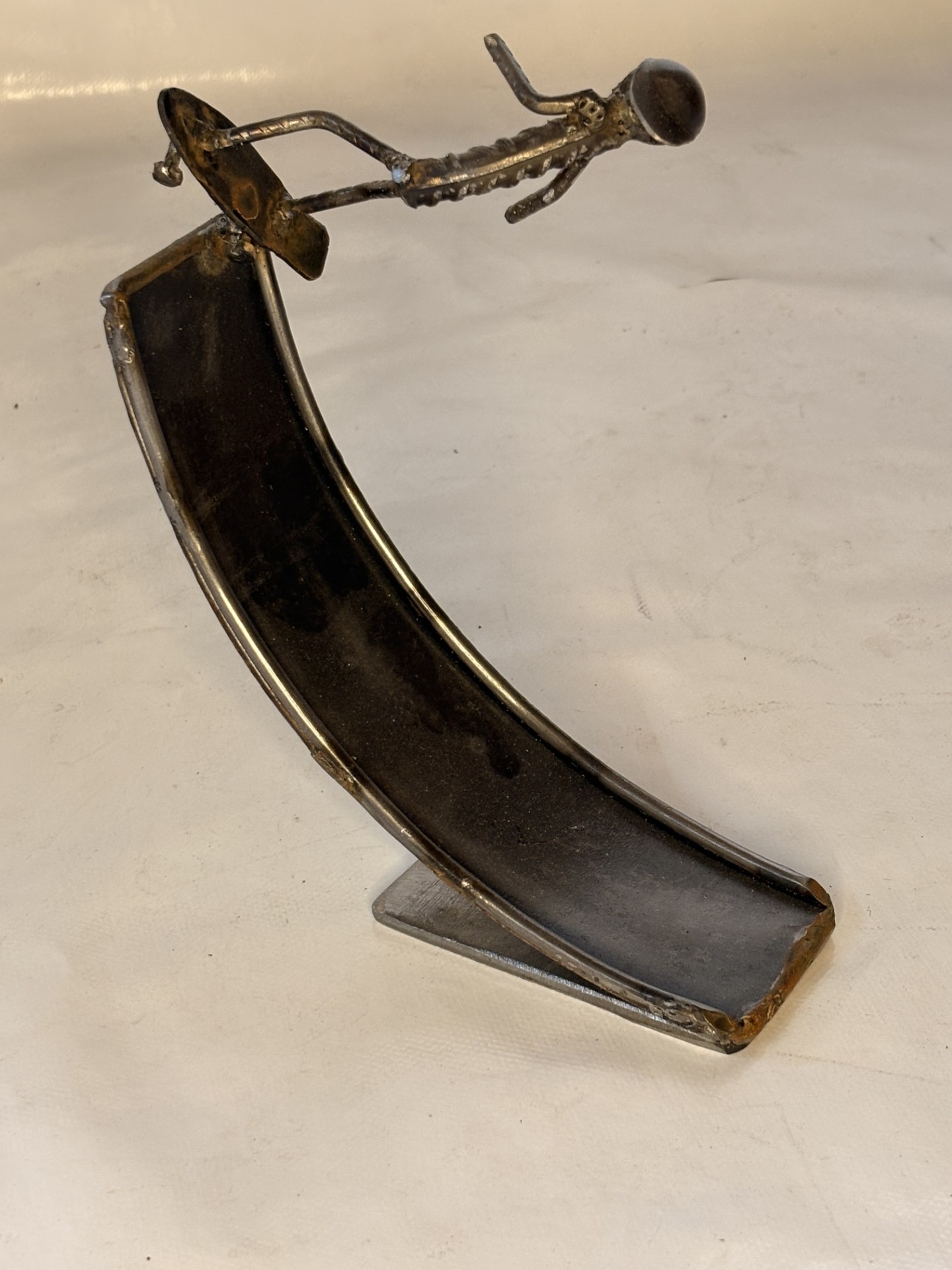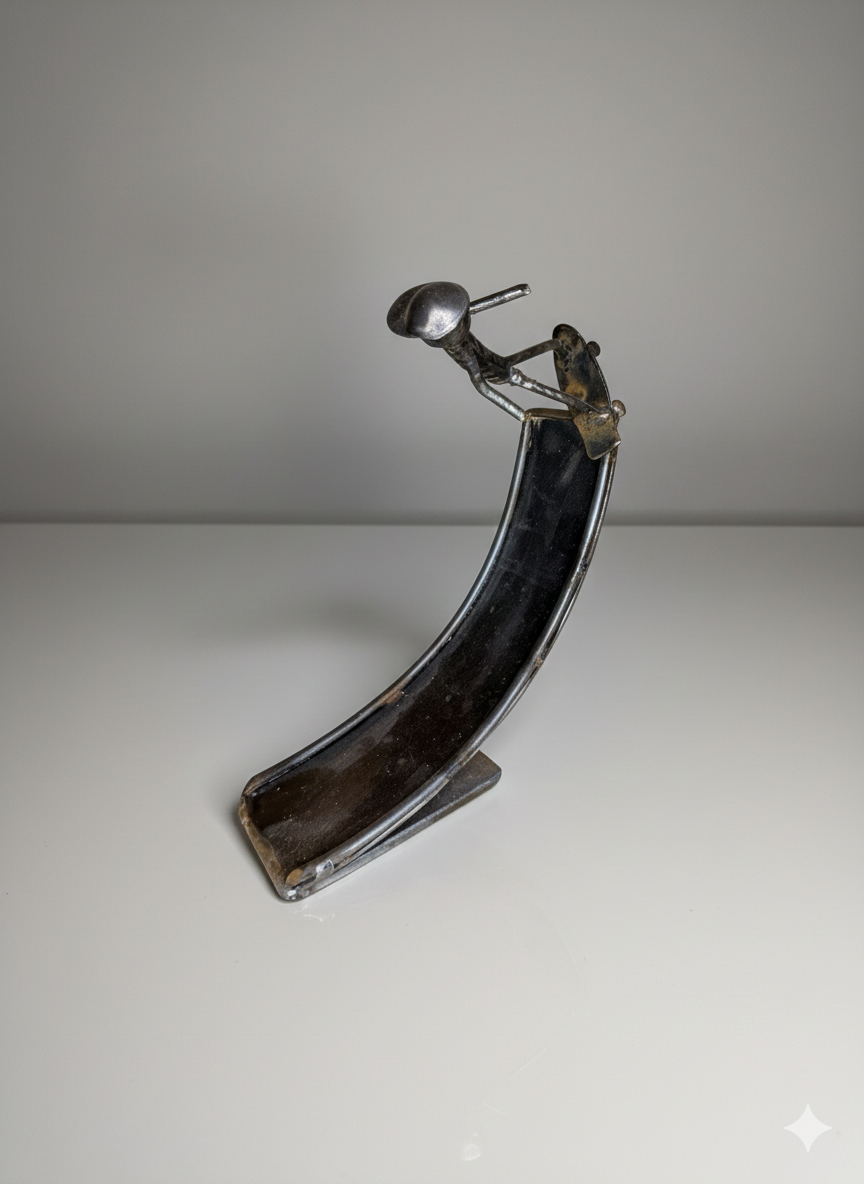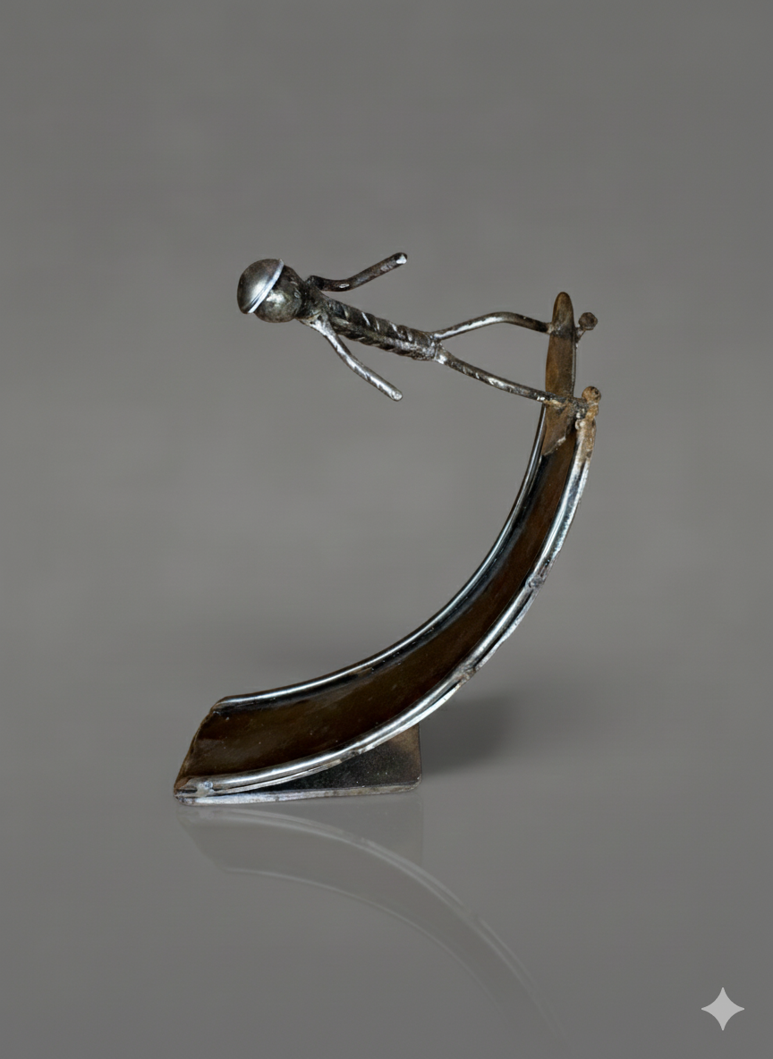 Cette sculpture en métal, entièrement façonnée à la main dans nos propres ateliers, exprime à la fois la force du matériau brut et la finesse du geste artisanal. Chaque personnage, soudé et modelé avec minutie, raconte une histoire : l’effort, la concentration, ou le mouvement, capturés dans une posture pleine de caractère.