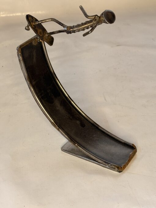 Réalisée à partir d’acier recyclé et travaillée pièce par pièce, chaque œuvre porte les marques uniques de sa création : nuances, traces de chauffe, reliefs et irrégularités rendent chaque sculpture authentiquement singulière.